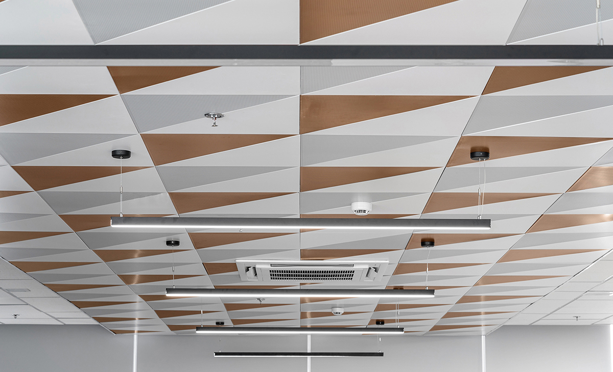 Trần nhôm Austrong Triangle - Tiles bề mặt được đục lỗ và được trang bị một lớp vải không dệt để kiểm soát âm thanh và giảm tiếng ồn. Dễ dàng thi công lắp đặt, không yêu cầu dụng cụ máy móc phức tạp, tương thích với các loại đèn chiếu sáng, loa âm thanh, thiết bị PCCC, Camera…